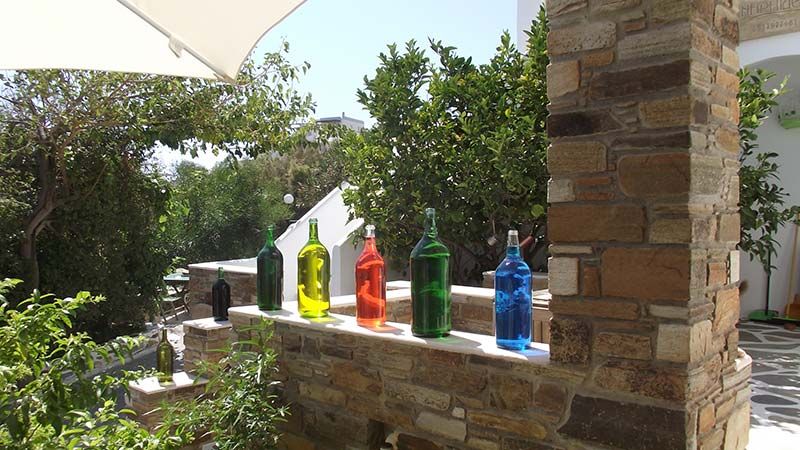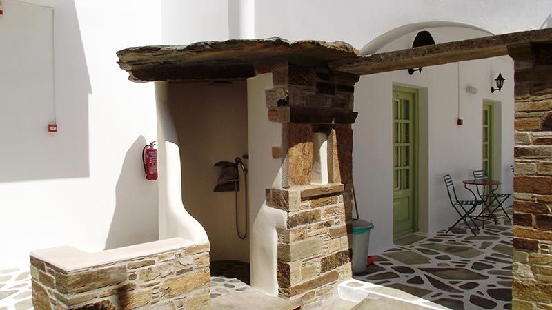 Οι εξωτερικοί χώροι των Νηρηίδες Rooms περιβάλλονται από κήπο, προσφέροντας γωνιές χαλάρωσης μέσα στη φύση. Η διακόσμηση εκεί είναι παραδοσιακή, με μαρμάρινες βρύσες στις αυλές και ντουζιέρα για όσους αναζητούν μια εναλλακτική όαση δροσιάς.